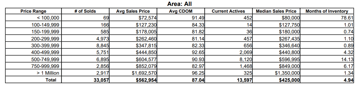 This provides a clear pulse check on today’s market, highlighting both inventory levels and how quickly homes are moving. Currently, the market is operating at 4.94 months of inventory, which places it in seller-leaning territoryoverall.